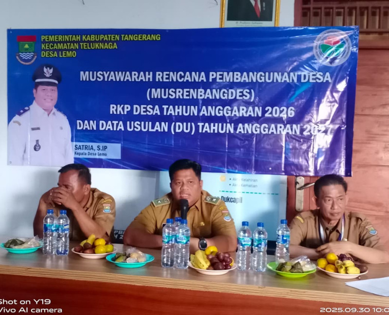 Pemerintah Desa Lemo, Kecamatan Teluknaga, Kabupaten Tangerang – Banten, menggelar Musyawarah Rencana Pembangunan Desa (Musrenbangdes) dalam rangka penyusunan Rencana Kerja Pemerintah (RKP) Desa Tahun anggaran 2026 serta pembahasan Data Usulan (DU) untuk Tahun 2027. Acara berlangsung di Kantor Desa Lemo pada Selasa (30/9/2025) Pagi.
