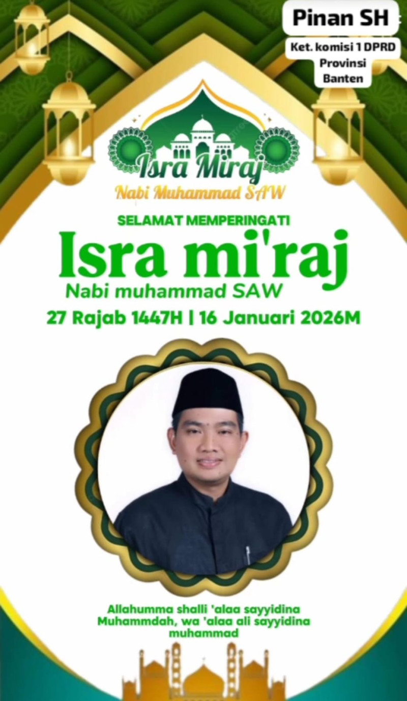 Dalam rangka memperingati peristiwa Agung Isra Miraj Nabi Muhammad SAW, Ketua Komisi I DPRD Provinsi Banten, Pinan SH, mengajak seluruh masyarakat Banten untuk menjadikan momen ini sebagai sarana memperkuat keimanan, ketakwaan, serta meningkatkan kualitas akhlak dalam kehidupan Sehari-hari.
